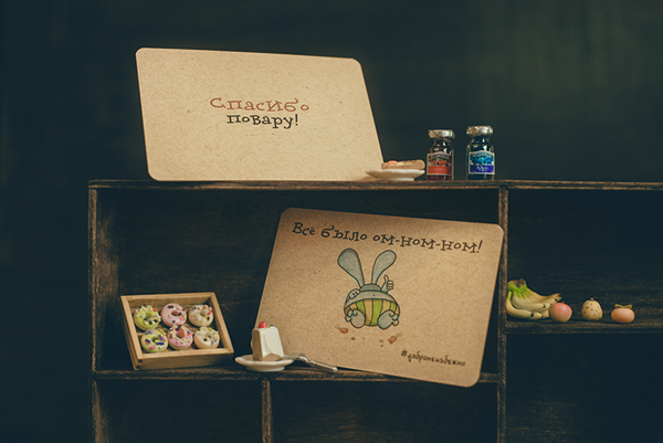 Когда вам кто-то помог, а простого “спасибо” недостаточно — подарите доброкарту с надписью “Любое добро обязательно вернётся” этому хорошему человеку, он сохранит её и будет продолжать делать добро. Если кто-то грустит, неважно знакомый или нет — подарите ему карту с нарисованным шариком и человек улыбнётся, передаст своё хорошее настроение другим, и будет вспоминать о вас каждый раз, когда вновь будет находить эту доброкарту у себя. Вкусно пообедал в ресторане — передай карту “Всё было ом-ном-ном” для повара, ему будет очень приятно. Пока есть 12 разных доброкарт, с добрыми словами, комплиментами и благодарностью, которые призваны менять мир вместе с вами. Достаточно только добавить улыбку и искренние намерения, даже говорить что-нибудь не обязательно, уютная карта сделает это за вас. Только дарить их нужно от души.