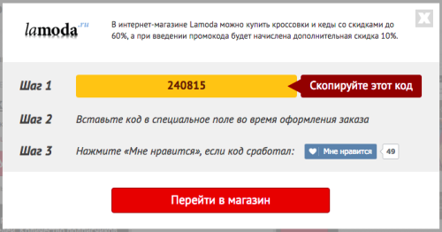 Когда нет времени ждать распродажи, а очень хочется поднять настроение получением скидки, можно воспользоваться купонами и промокодами, дающими право на скидку. В интернет-магазинах это работает так: сначала ищется промокод для нужного магазина, например, на сайте Picodi.ru, затем код копируется, а при оформлении заказа код необходимо указать в виртуальной корзине. Такой код может активировать скидку на все товары в заказе или на определённые категории товаров. Некоторые купоны дают бесплатную доставку или добавляют подарок за покупку.